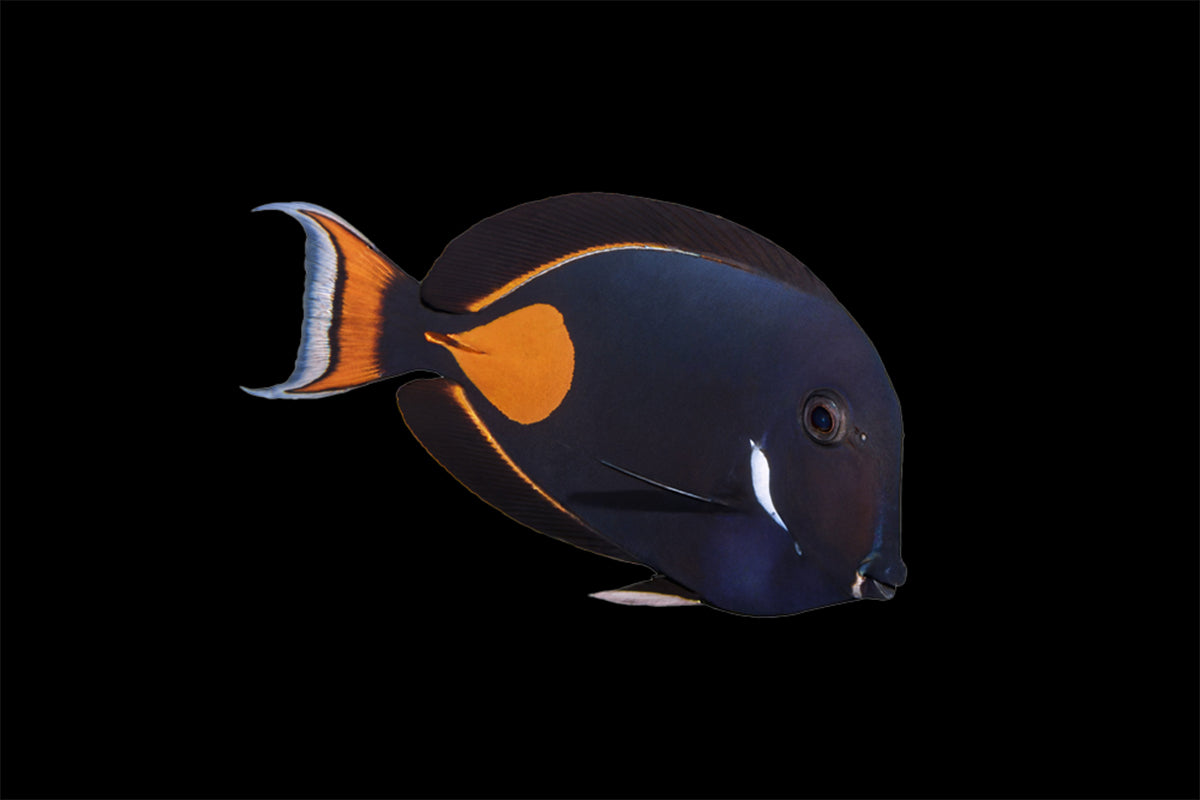 The Achilles Tang is a striking and highly sought-after surgeonfish, instantly recognized by its deep black body, bright orange spot near the tail, and vivid white markings on the dorsal and anal fins. Known for its active swimming and bold presence, it adds both color and dynamic movement to larger aquariums.