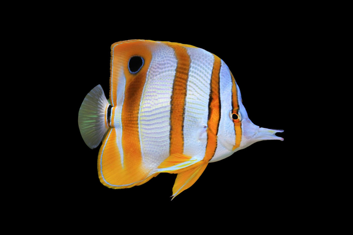 The Copperband Butterflyfish is a stunning marine species, easily recognized by its elongated snout and striking yellow and white vertical bands, accented with a bold black eye spot near the tail. Known for its graceful swimming and delicate appearance, it adds elegance and color to reef aquariums.