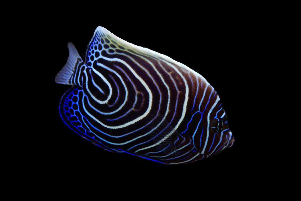 The Emperor Angelfish is a striking and iconic marine species, instantly recognized by its bold blue and yellow horizontal stripes, dark mask over the eyes, and vibrant tail. Its commanding presence and vivid coloration make it a standout centerpiece in larger reef or fish-only aquariums.