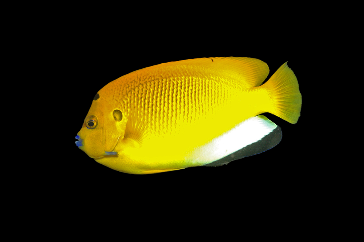 The Flagfin Angelfish is a stunning and graceful species, easily recognized by its bright yellow body, contrasting blue lips, and distinctive black spot just behind the gill cover. Its elegant form and vivid coloration make it a showpiece in large aquariums. Though shy at first, this angelfish becomes more confident over time, adding a touch of tropical brilliance and movement to any display.