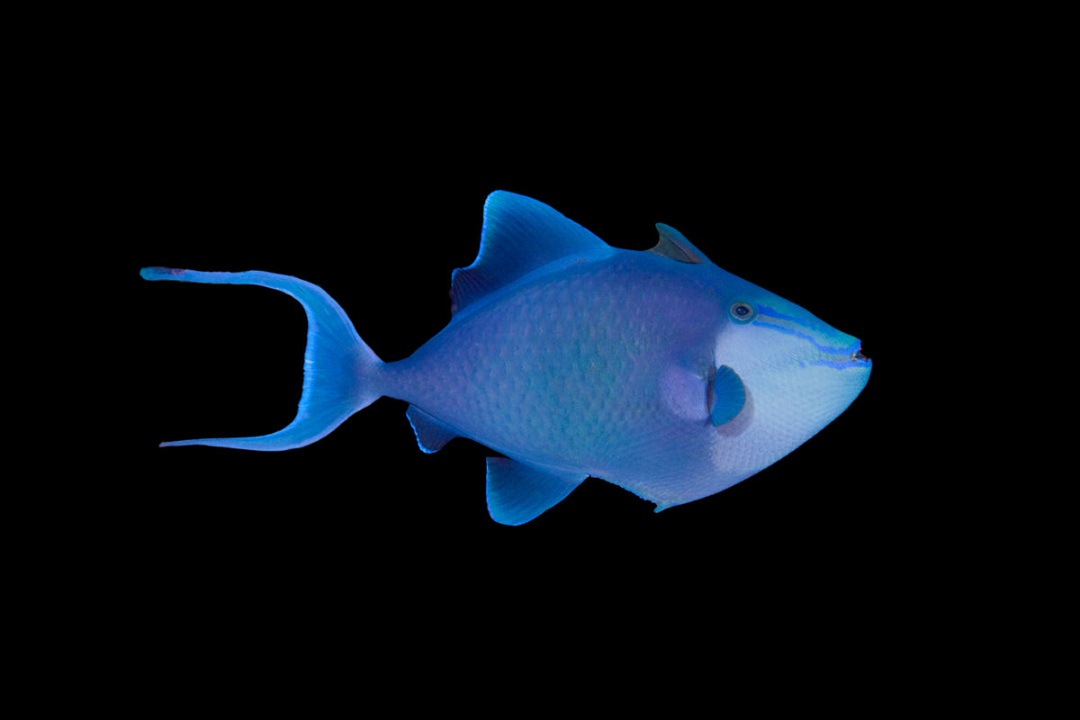 The Niger Triggerfish, also known as the Redtoothed Triggerfish or Blue Fin Triggerfish, is a striking and active marine species, easily recognized by its deep blue to purple body and vibrant red teeth. Its bold color and energetic swimming behavior make it a standout centerpiece in larger aquariums.