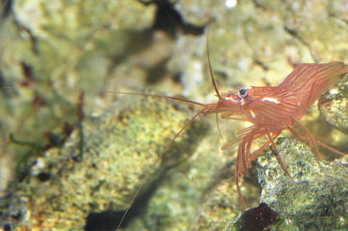 The Peppermint Shrimp is a small, striking marine invertebrate, recognized by its translucent body with red stripes running along its length. Known for its peaceful nature and natural aptitude for controlling pest populations like Aiptasia anemones, it is both a visually appealing and functional addition to reef aquariums.