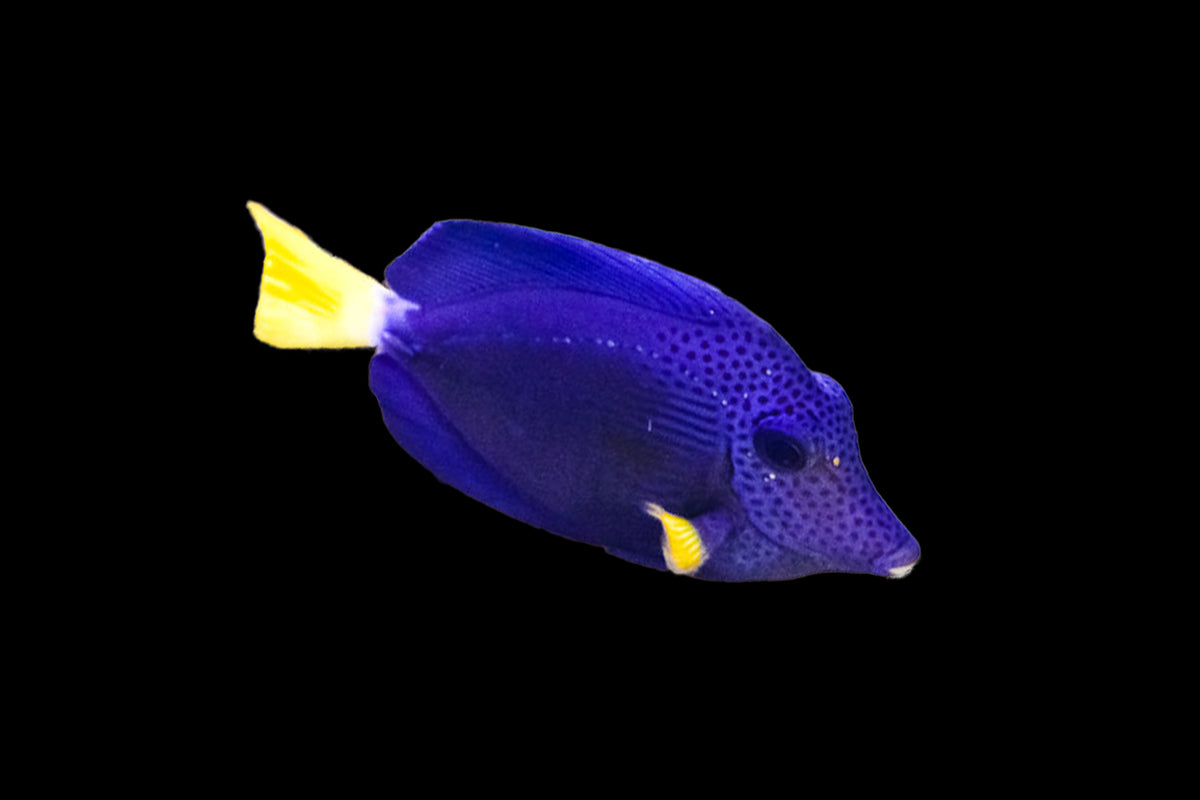 The Purple Tang is a striking surgeonfish, instantly recognized by its deep purple body, bright yellow tail, and elegant body shape. Known for its active swimming and bold presence, it adds both vibrant color and dynamic movement to reef and fish-only aquariums.
