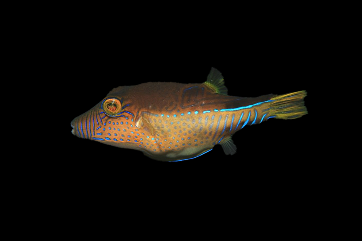 The Sharpnose Puffer is a small, striking, and highly active pufferfish, easily recognized by its elongated snout, bright white body, and vivid blue and yellow markings along the fins and tail. Known for its curious personality and playful behavior, it constantly explores its surroundings, making it a fascinating addition to reef and marine aquariums.