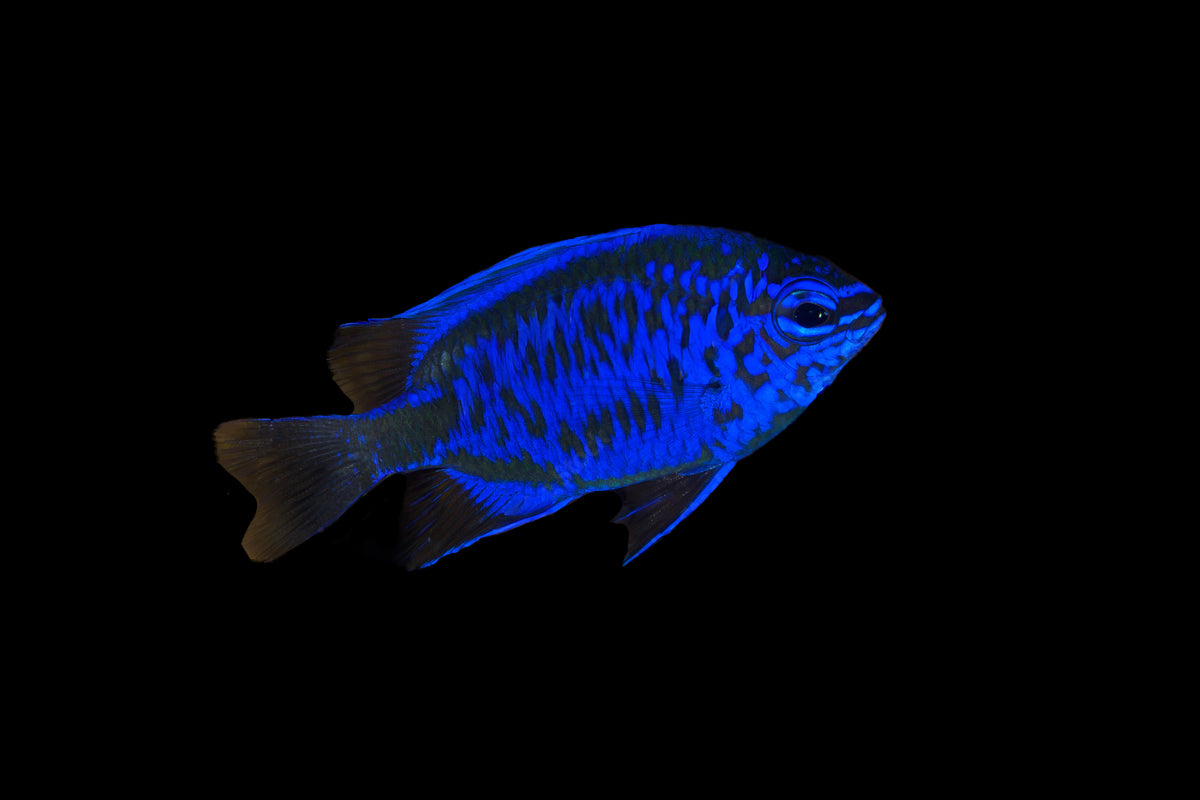 The Springeri Damselfish is a striking species known for its deep blue to midnight-black body accented with bright electric-blue streaks along the fins and face. Small, hardy, and active, it is a popular choice for reef aquariums due to its vibrant coloration and adaptability. Compared to many other damselfish, it is less aggressive, making it more suitable for community tanks.