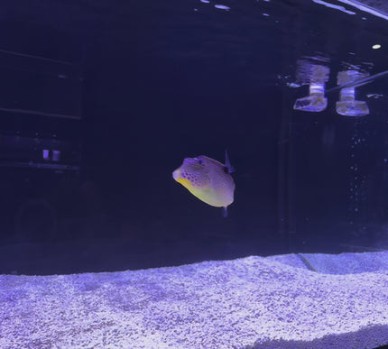 The Blue Spotted Puffer, also known as the Blue Spotted Toby, is a striking little fish with a dark brown to black body covered in vivid blue spots and lined with electric-blue highlights. Its curious personality and unique swimming style make it a fun and engaging addition to the aquarium, often becoming a favorite among hobbyists. Compact yet bold, this puffer stands out as both colorful and full of character.